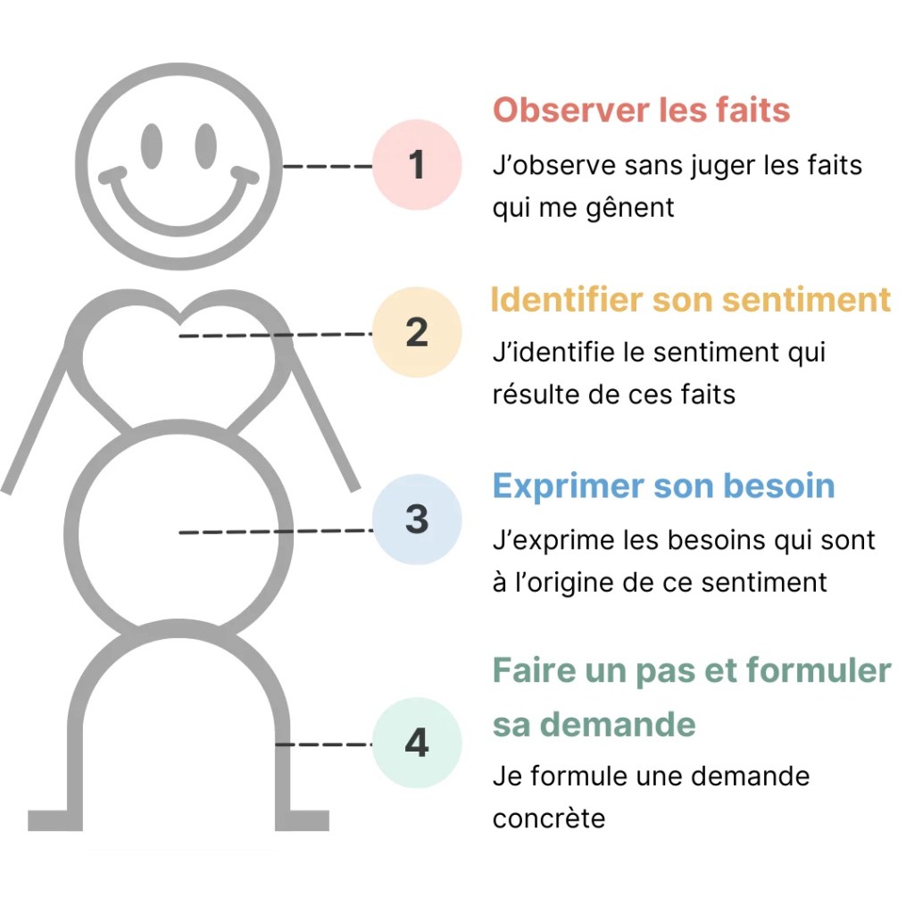 On commence par écouter ce que l’on ressent, savoir l’identifier, le sentir dans son corps et y mettre des mots. Déjà ça, c’est un grand pas ! Viens ensuite celui de comprendre ce que cette émotion dit de ce qui est important pour nous (approche narrative), aussi appelé le besoin en CNV. Ainsi nous pouvons nous adresser à l’autre pour lui formuler une demande et lui exprimer notre ressenti.